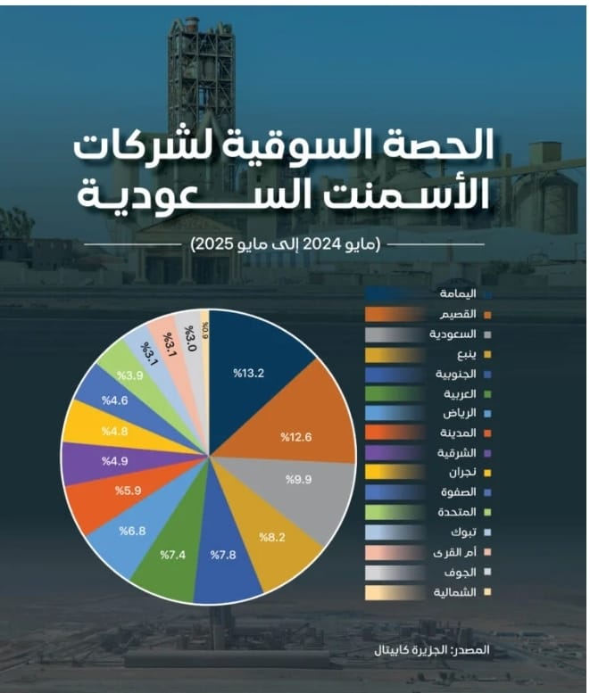 بالانفوجرافيك .. الحصة السوقية لشركات الأسمنت في المملكة – مايو 2024 إلى مايو 2025