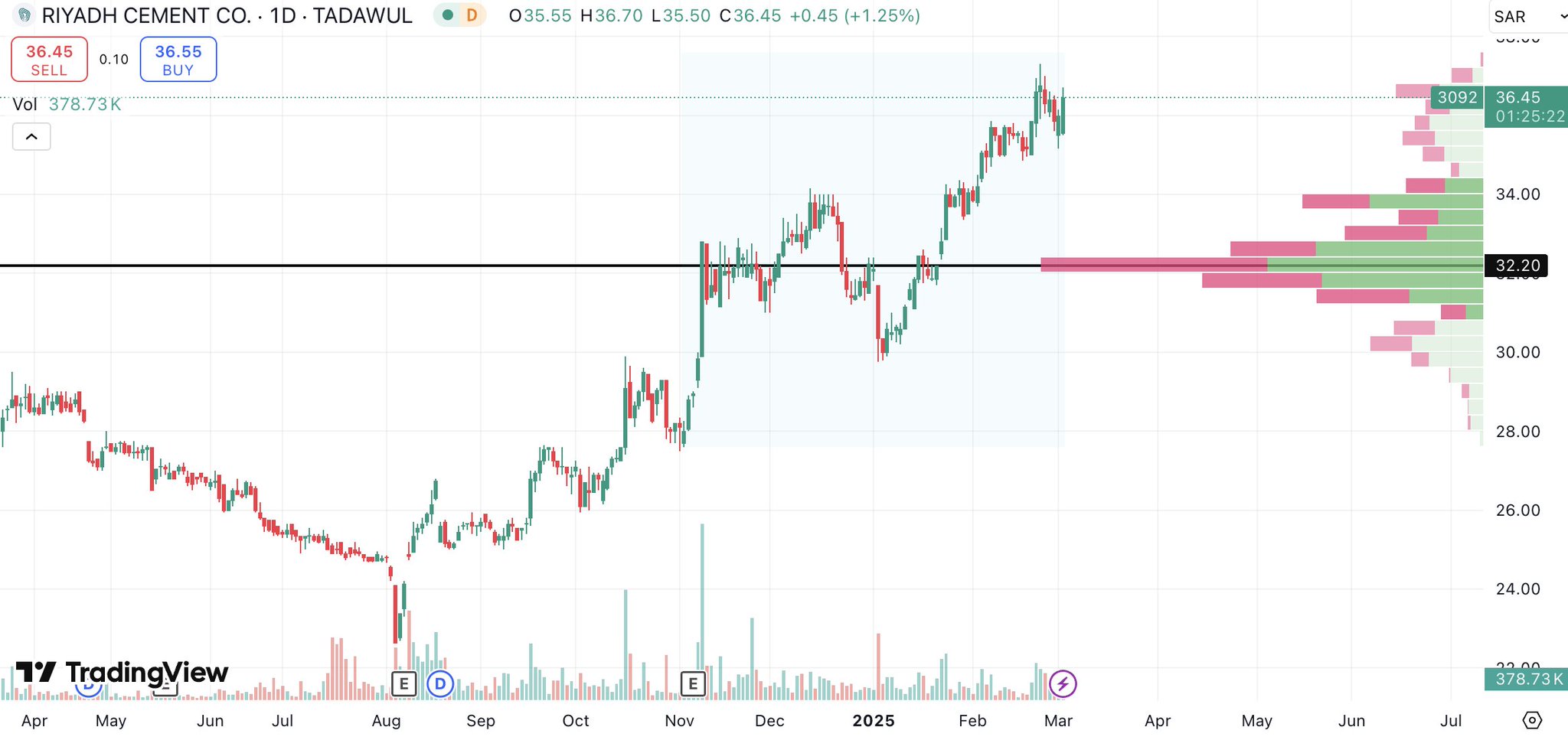 #أسمنت_الرياض يشهد اتجاهًا صعودًيا قويًا بنسبة 26% خلال الأشهر الثلاثة الماضية.(قمم أعلى وقيعان أع...