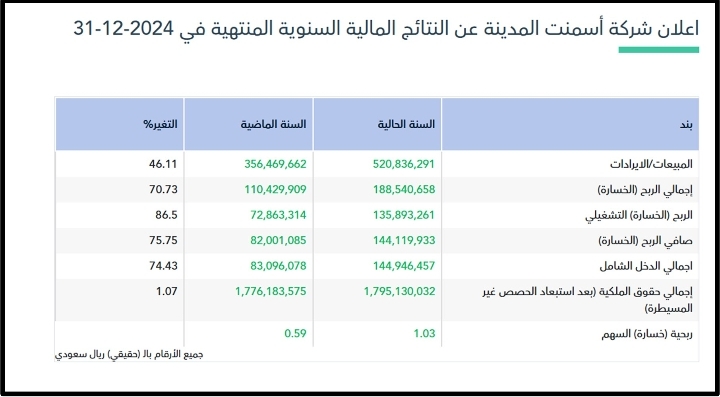 أعلنت شركة أسمنت المدينة عن نتائج المالية السنوية المنتهية 31-12-2024 .مبيعاتها ارتفعت 46%صافي...